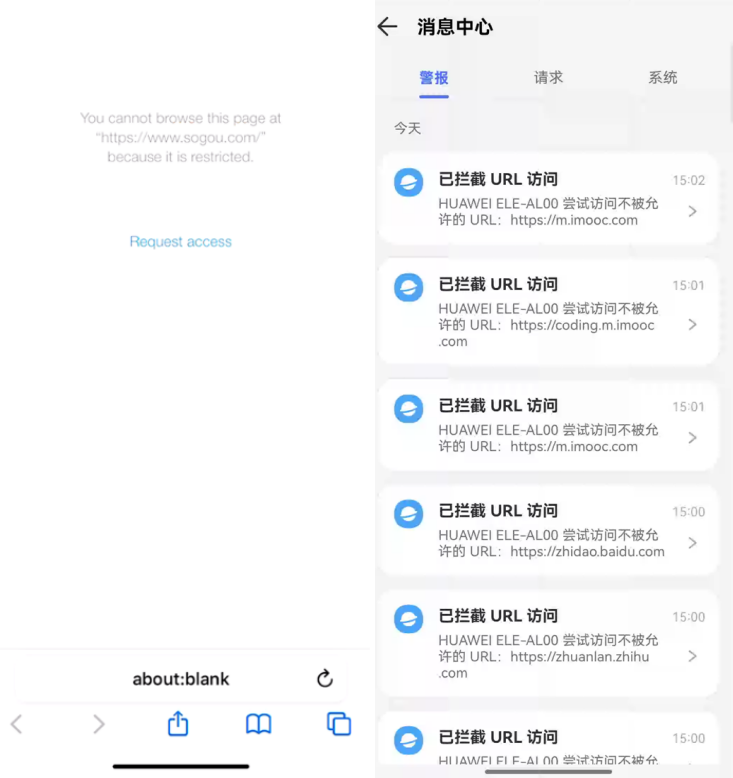 点击“请求”按钮,会显示孩子设备请求解开限制的信息,可根据实际情况进行操作。