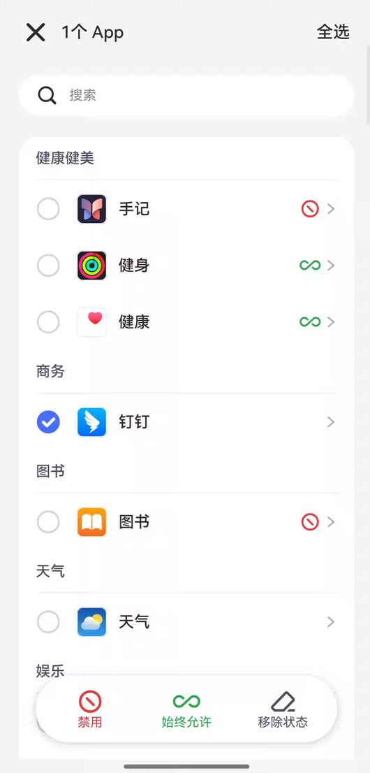 第1步:点击“应用列表”,可选择点击右侧圆点选择对应用进行“禁用”“始终允许”“移除状态”等选择,或者点击左侧的>,了解应用使用情况或设置应用限制。