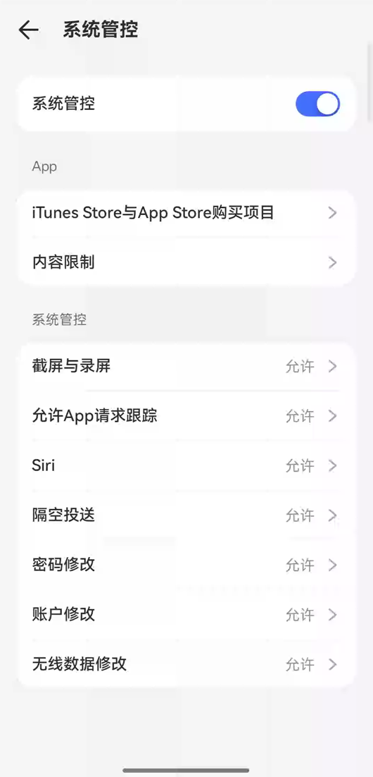开启系统管控后,可以对孩子设备的系统、应用进行限制。