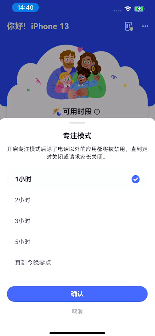 孩子可以随时开启“专注模式”,启用后,iPhone上只有手机、时钟、设置和AirDroid Kids仍可访问。所有通知都会静音,以让孩子保持专注。专注模式将持续开启,直到设定时间结束或家长关闭。